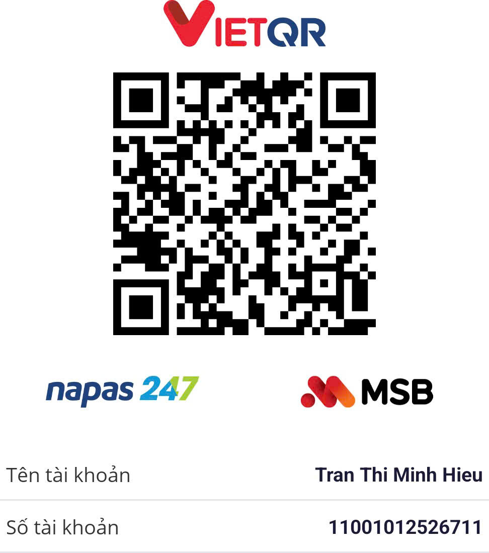 | Ngân hàng TMCP Hàng Hải Việt Nam (MSB) | 11001012526711 | Trần Thị Minh Hiếu | TẠI ĐÂY |