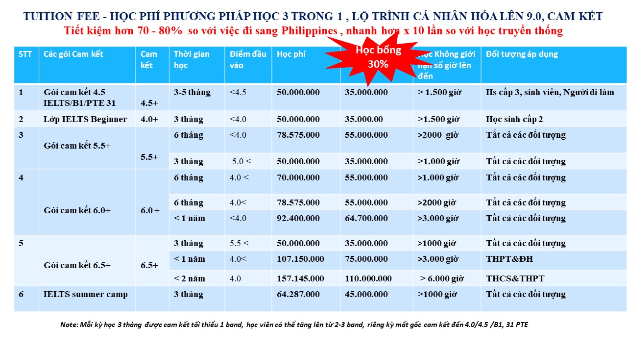 Online qua thẻ: https://thanhtoan.msb.com.vn/epayment?to=hrdglobal Offline chuyển khoản: CHƯƠNG TRÌNH TRẢ GÓP HỌC PHÍ LÃI SUẤT 0 ĐỒNG Trả góp học phí là gì? Trả góp là hình thức đóng học phí mà học viên không cần phải trả toàn bộ học phí một lần. Thay vào đó, chỉ cần thanh toán một phần học phí, phần còn lại sẽ được thanh toán dần theo kỳ hạn. Khi đóng học phí với hình thức trả góp thì khoản học phí sẽ được chia nhỏ để học viên có thể dễ dàng trả theo các kỳ hạn 3 tháng, 6 tháng, 9 tháng, 12 tháng…). Hình thức đóng học phí trả góp này không yêu cầu học viên phải thế chấp tài sản mà thay vào đó là các thủ tục đơn giản, nhanh chóng hơn giúp cho học viên dễ dàng tiếp cận với các chương trình học chất lượng cao. Việc trả góp hiện nay rất tiện lợi, mang lại rất nhiều lợi ích như: QUY TRÌNH ĐÓNG HỌC PHÍ TRẢ GÓP Bước 1: Tìm hiểu chương trình học tại IELTS 9.0 và làm thủ tục đăng ký học theo hướng dẫn của nhân viên tư vấn Bước 2: chọn kỳ hạn trả góp Bước 3: Gặp trực tiếp nhân viên đại diện ngân hàng để hoàn thành các thủ tục cần thiết. Bước 4: Sau khi đã hoàn thành xong các bước trên thì bạn nhận thư mời nhập học có mã số học viên và tiến hành nhập học. Một số câu hỏi thường gặp Bạn sẽ bị phạt tiền theo mức lãi suất quy định của ngân hàng Mọi thắc mắc xin liên hệ Ms. Hiếu ĐT: 0981978999 để được tư vấn chi tiết