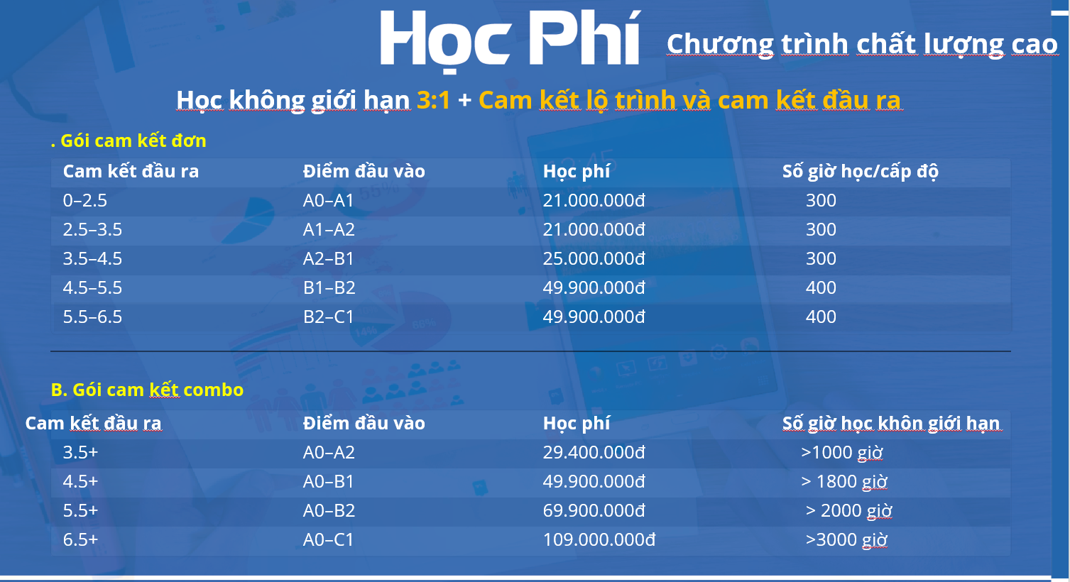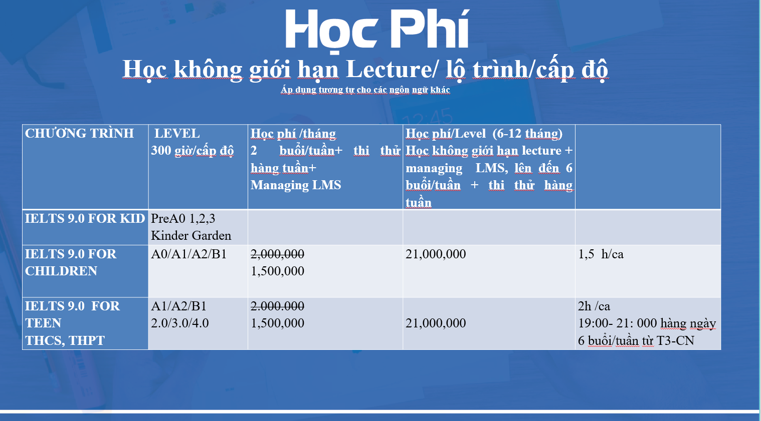 THANH TOÁN HỌC PHÍ Online qua thẻ: https://thanhtoan.msb.com.vn/epayment?to=hrdglobal Offline chuyển khoản: CHƯƠNG TRÌNH TRẢ GÓP HỌC PHÍ LÃI SUẤT 0 ĐỒNG Trả góp học phí là gì? Trả góp là hình thức đóng học phí mà học viên không cần phải trả toàn bộ học phí một lần. Thay vào đó, chỉ cần thanh toán một phần học phí, phần còn lại sẽ được thanh toán dần theo kỳ hạn. Khi đóng học phí với hình thức trả góp thì khoản học phí sẽ được chia nhỏ để học viên có thể dễ dàng trả theo các kỳ hạn 3 tháng, 6 tháng, 9 tháng, 12 tháng…). Hình thức đóng học phí trả góp này không yêu cầu học viên phải thế chấp tài sản mà thay vào đó là các thủ tục đơn giản, nhanh chóng hơn giúp cho học viên dễ dàng tiếp cận với các chương trình học chất lượng cao. Việc trả góp hiện nay rất tiện lợi, mang lại rất nhiều lợi ích như: QUY TRÌNH ĐÓNG HỌC PHÍ TRẢ GÓP Bước 1: Tìm hiểu chương trình học tại IELTS 9.0 và làm thủ tục đăng ký học theo hướng dẫn của nhân viên tư vấn Bước 2: chọn kỳ hạn trả góp Bước 3: Gặp trực tiếp nhân viên đại diện ngân hàng để hoàn thành các thủ tục cần thiết. Bước 4: Sau khi đã hoàn thành xong các bước trên thì bạn nhận thư mời nhập học có mã số học viên và tiến hành nhập học. Một số câu hỏi thường gặp Bạn sẽ bị phạt tiền theo mức lãi suất quy định của ngân hàng Mọi thắc mắc xin liên hệ Ms. Hiếu ĐT: 0981978999 để được tư vấn chi tiết