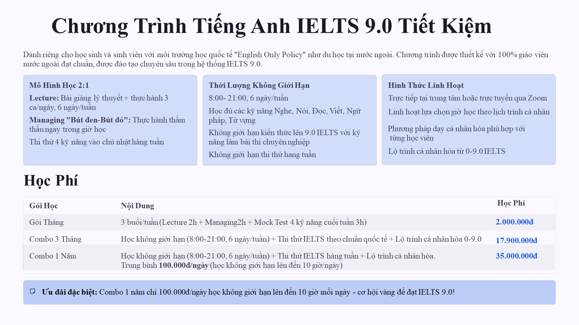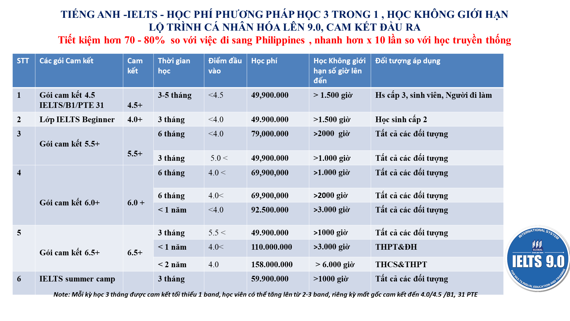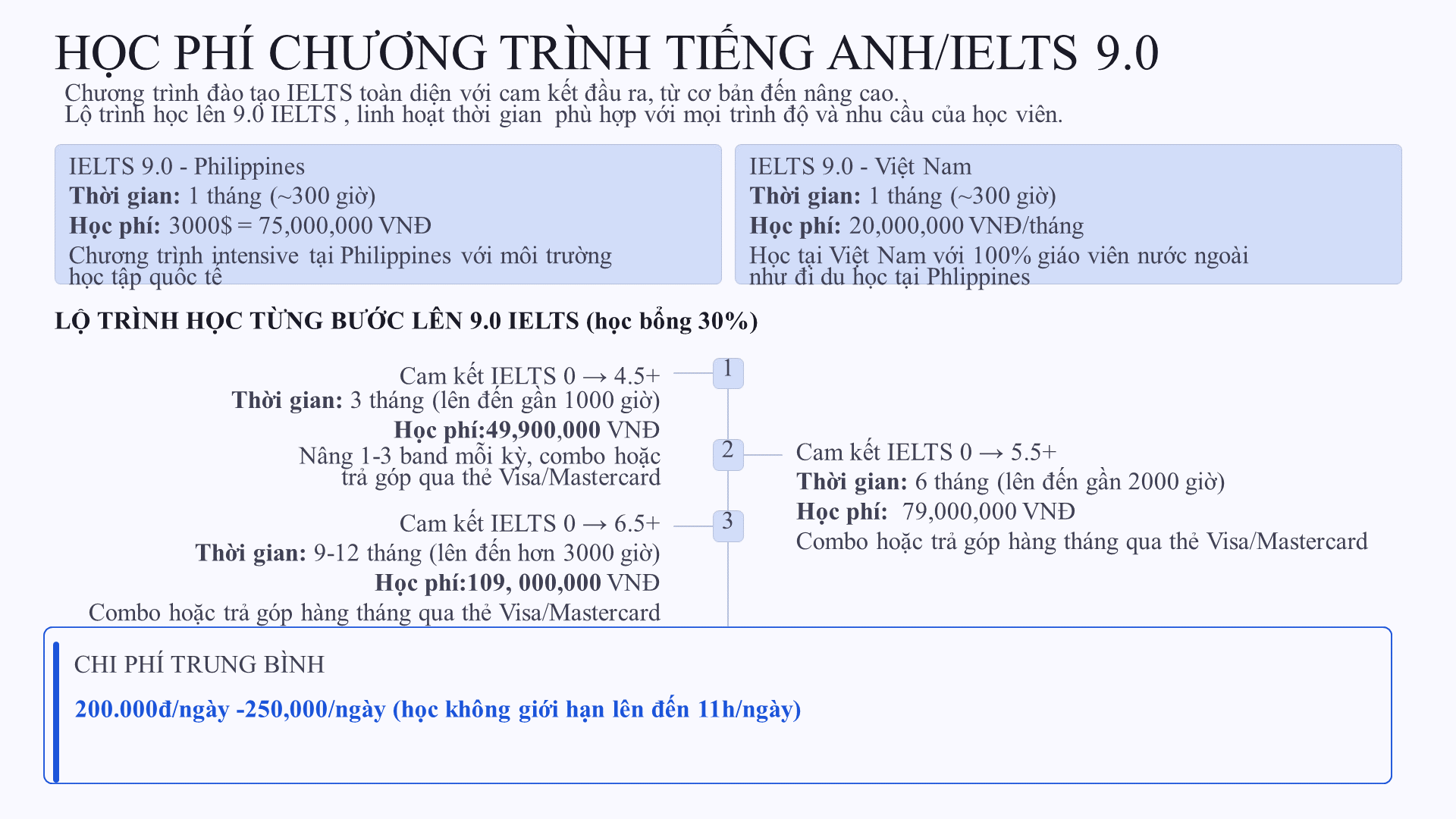 THANH TOÁN HỌC PHÍ Online qua thẻ: https://thanhtoan.msb.com.vn/epayment?to=hrdglobal Offline chuyển khoản: CHƯƠNG TRÌNH TRẢ GÓP HỌC PHÍ LÃI SUẤT 0 ĐỒNG Trả góp học phí là gì? Trả góp là hình thức đóng học phí mà học viên không cần phải trả toàn bộ học phí một lần. Thay vào đó, chỉ cần thanh toán một phần học phí, phần còn lại sẽ được thanh toán dần theo kỳ hạn. Khi đóng học phí với hình thức trả góp thì khoản học phí sẽ được chia nhỏ để học viên có thể dễ dàng trả theo các kỳ hạn 3 tháng, 6 tháng, 9 tháng, 12 tháng…). Hình thức đóng học phí trả góp này không yêu cầu học viên phải thế chấp tài sản mà thay vào đó là các thủ tục đơn giản, nhanh chóng hơn giúp cho học viên dễ dàng tiếp cận với các chương trình học chất lượng cao. Việc trả góp hiện nay rất tiện lợi, mang lại rất nhiều lợi ích như: QUY TRÌNH ĐÓNG HỌC PHÍ TRẢ GÓP Bước 1: Tìm hiểu chương trình học tại IELTS 9.0 và làm thủ tục đăng ký học theo hướng dẫn của nhân viên tư vấn Bước 2: chọn kỳ hạn trả góp Bước 3: Gặp trực tiếp nhân viên đại diện ngân hàng để hoàn thành các thủ tục cần thiết. Bước 4: Sau khi đã hoàn thành xong các bước trên thì bạn nhận thư mời nhập học có mã số học viên và tiến hành nhập học. Một số câu hỏi thường gặp Bạn sẽ bị phạt tiền theo mức lãi suất quy định của ngân hàng Mọi thắc mắc xin liên hệ Ms. Hiếu ĐT: 0981978999 để được tư vấn chi tiết