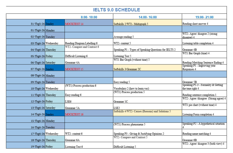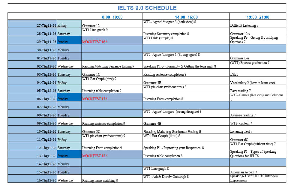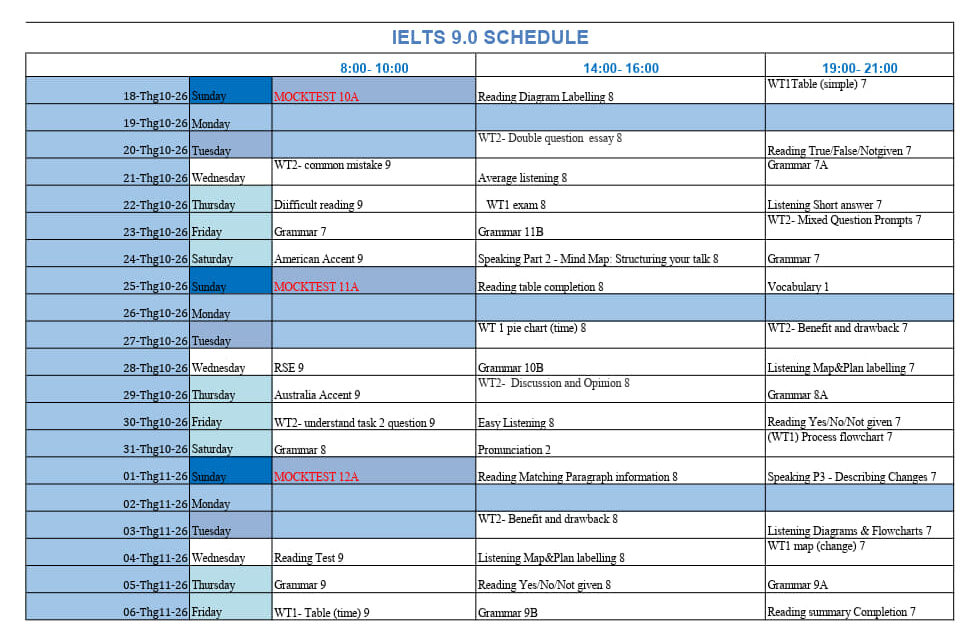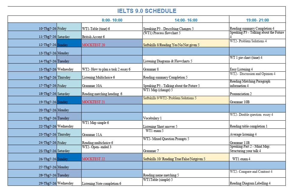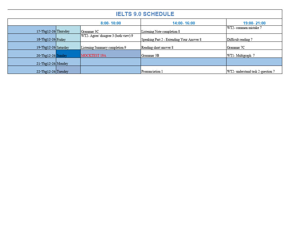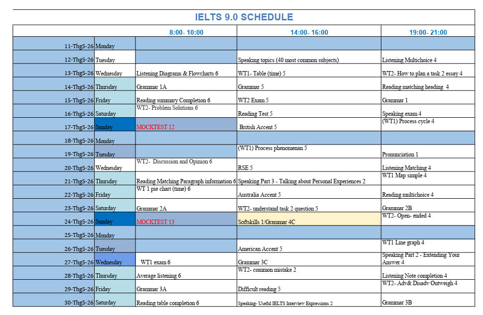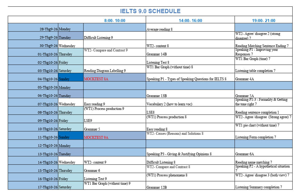THỜI GIAN: 2:00-4:00 chiều chủ nhật hàng tuần.trong thời hè từ 1/6-30/8 tại tất cả các sơ sở đào tạo của IELTS 9.0