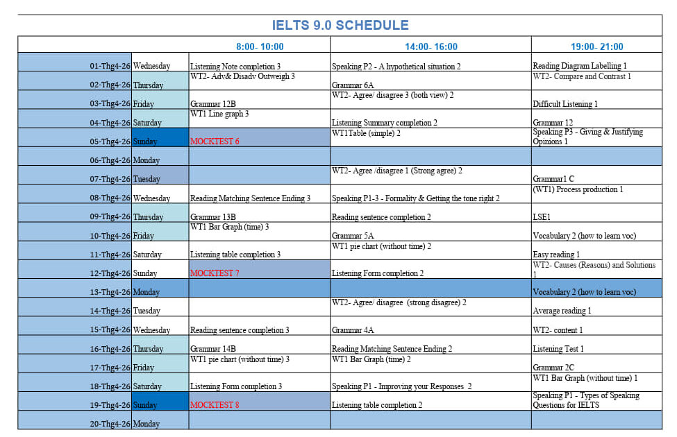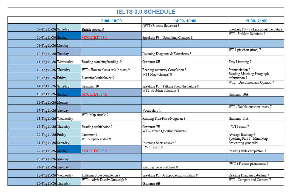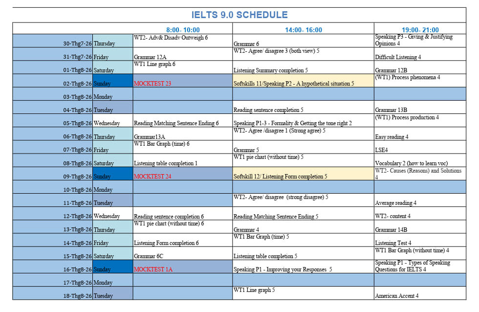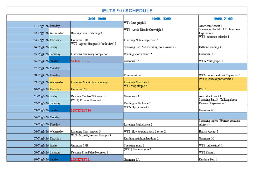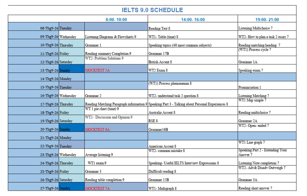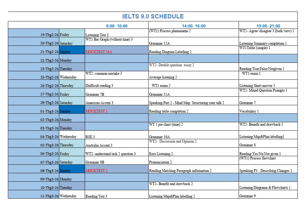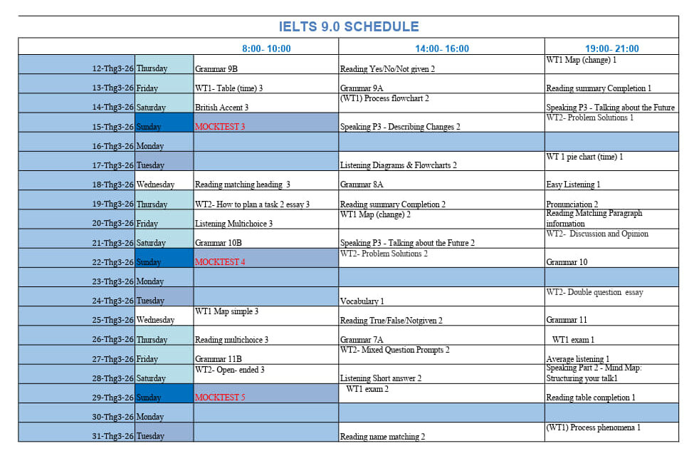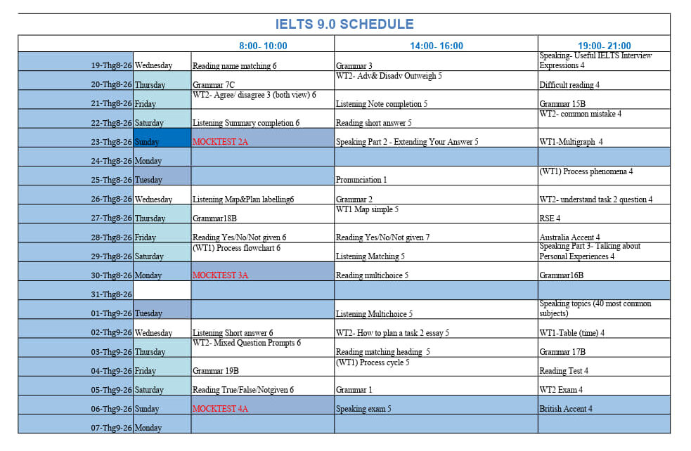 THỜI GIAN: 2:00-4:00 chiều chủ nhật hàng tuần.trong thời hè từ 1/6-30/8 tại tất cả các sơ sở đào tạo của IELTS 9.0